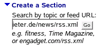 Wie gesagt: hier sind momentan nur englischsprachige Infodienste gelistet. Uns interessiert daher der unterste Abschnitt der Konfigurationsleiste: "Create a Section" (Bild rechts, Klick vergrößert!). Darunter findet man ein Eingabefeld, in dem man einfach die URL des gewünschten RSS-Feeds eingibt.