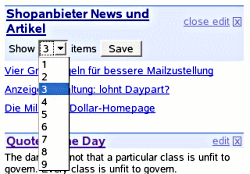 Per Standard werden nur die drei aktuellsten Meldungen eingeblendet. Wem das nicht reicht, der kann diese Zahl auch noch hochsetzen. Diese Funktion verbirgt sich hinter dem winzigen "Edit"-Schalter rechts oberhalb der Shopanbieter-Meldungen (Bild links, Klick vergrößert!). Das Maximum sind neun Einträge.