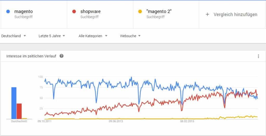 Wie eine aktuelle Google Trends-Auswertung zeigt, wird mittlerweile nach Shopware häufiger als nach Magento gesucht. Auch die Einführung von Magento 2 konnte diese Entwicklung nicht stoppen.
