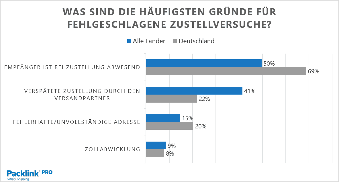 Auch das zweite Chart bestätigt die Sorgen der Paketdienstleister: Denn allen Bemühungen um immer genauere Lieferfenster, Echtzeit-Paket-Tracking und Wahl des Lieferorts zum Trotz scheitert die Zustellung eines Online-Bestellung immer noch vor allem daran, dass der Empfänger des Pakets schlichtweg nicht zuhause ist.