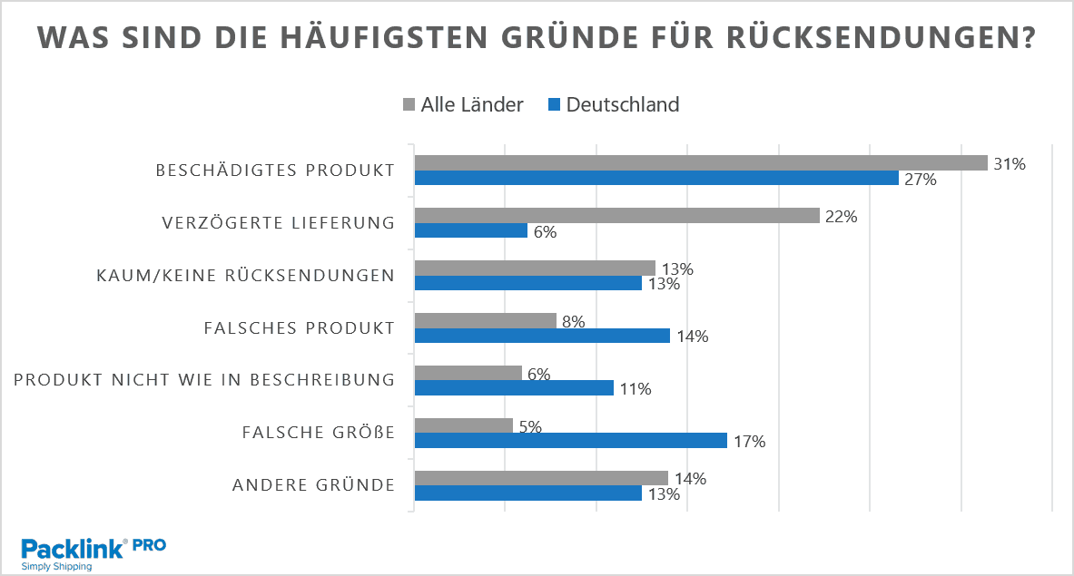 Egal ob in Deutschland oder anderswo, eine Zahl aus der Umfrage sollte alle Händler auf den Plan rufen: Denn laut der packlink-Umfrage werden 31 Prozent der Retouren (in Deutschland: 27 Prozent) zurückgeschickt, weil die verpackte Ware in beschädigtem Zustand angekommen war – ein echtes Armutszeugnis für alle Paketdienstleister.