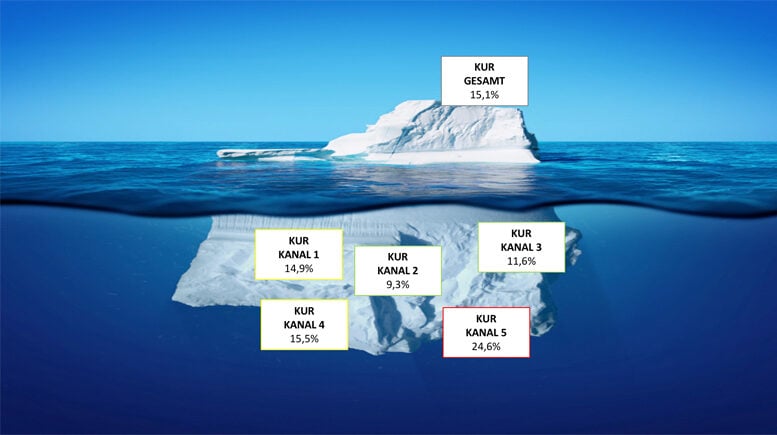 Schauen wir uns also dafür die Marketing-Kosten nicht wie bisher als pauschalen Gesamtkostenblock an, sondern differenzieren wir nach Kosten-Umsatz-Relation (KUR) in den einzelnen Marketing-Kanälen. Wie gut performen die Kampagnen beispielsweise bei Google Adwords, bei idealo, bei Amazon Marketing oder via E-Mail-Marketing? Hier merken wir schnell: Eine Marketing-Pauschale zeigt uns nur die Spitze des Eisbergs – erst unter der Wasseroberfläche wird es interessant.