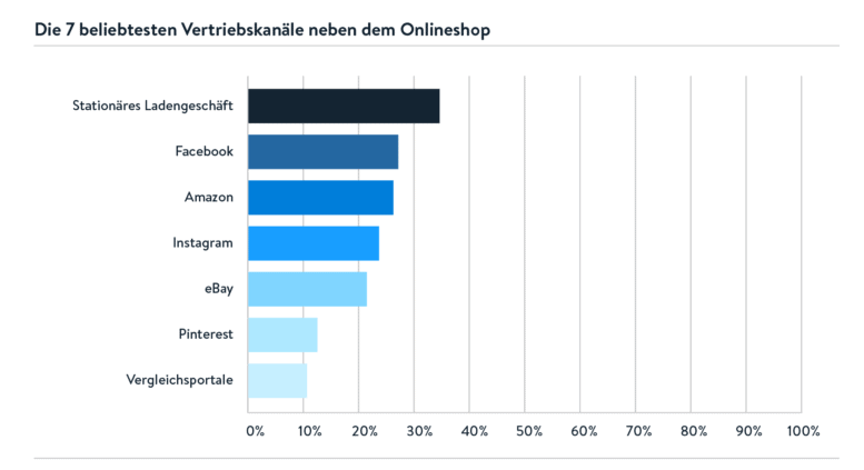 Bei der Frage nach den am häufigsten genutzen Vertriebskanälen abseit des eigenen Online-Shops gab es dagegen keine Überraschungen. Rund jeder dritte befragte Shopware-Händler vertreibt seine Produkte neben dem Onlineshop auch im stationären Ladengeschäft. Beliebte Vertriebskanäle sind außerdem Amazon (26 %) und eBay (20 %). Auffällig ist aber: Der Verkauf über Social-Media-Kanäle wird immer wichtiger. Hier stechen Facebook (27 %), Instagram (23 %) und Pinterest (12 %) heraus.