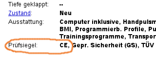 Händlern, die Geräte wie beispielsweise Heimtrainer über eBay anbieten wollen, kommt eBay bei der Eingabe der Geräteeigenschaften entgegen: Diverse vordefinierte Felder müssen nur angeklickt werden, um Eigenschaften wie Transportrollen, Klappbarkeit, Transportrollen, Pulssteuerung etc. anzugeben. Auch diverse Prüfsiegel können per einfachem Klick eingetragen werden: GS, TÜV sowie (gleich als erstes) CE. Wer hier das Kästchen für das CE-Kennzeichen anklickt, erzeugt eine Artikelbeschreibung in der wörtlich steht: "Prüfsiegel: CE".
